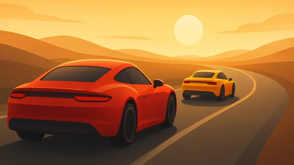A animação usa detalhes realistas no desgaste dos carros, fumaça e reflexos. Isso ajuda a criar empatia, porque vemos sinais de esforço e tempo nos personagens.