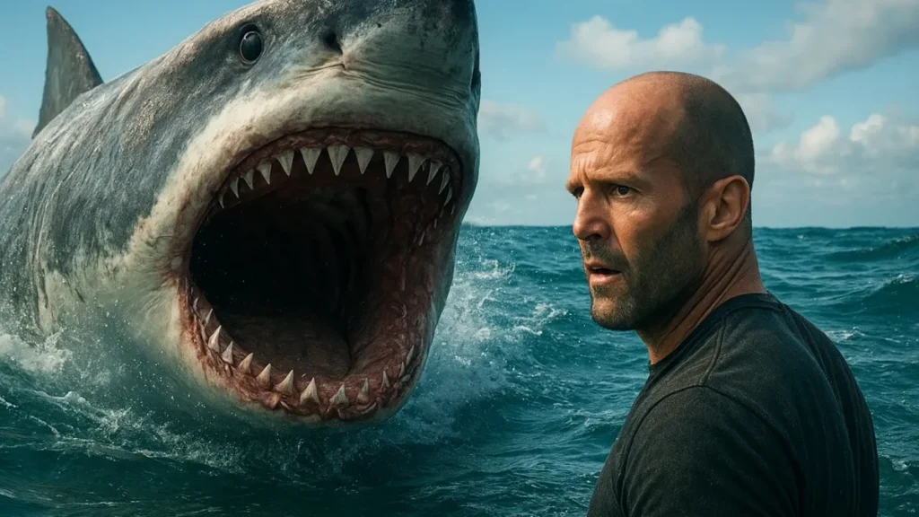 A imagem de um megalodonte gigante remete ao desconhecido. Quando o nome Jason Statham aparece junto, o público espera ação intensa e personagens que reagem rápido. A junção cria um contraste poderoso entre humano e besta pré-histórica.