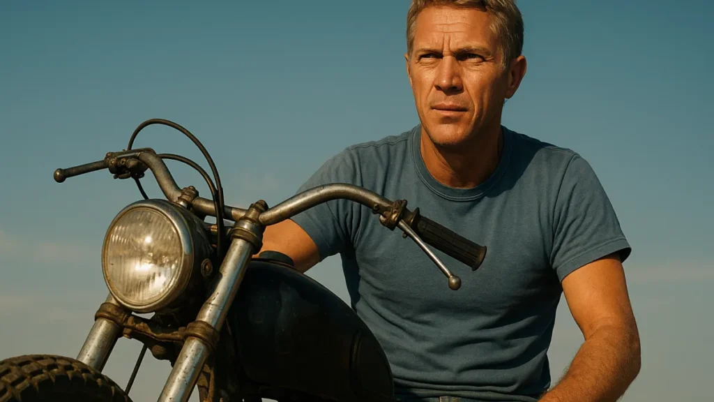 Steve McQueen não inventou a cultura das motos, mas ajudou a torná-la icônica. A imagem do ator em selim, com postura natural, virou referência para colecionadores e entusiastas.