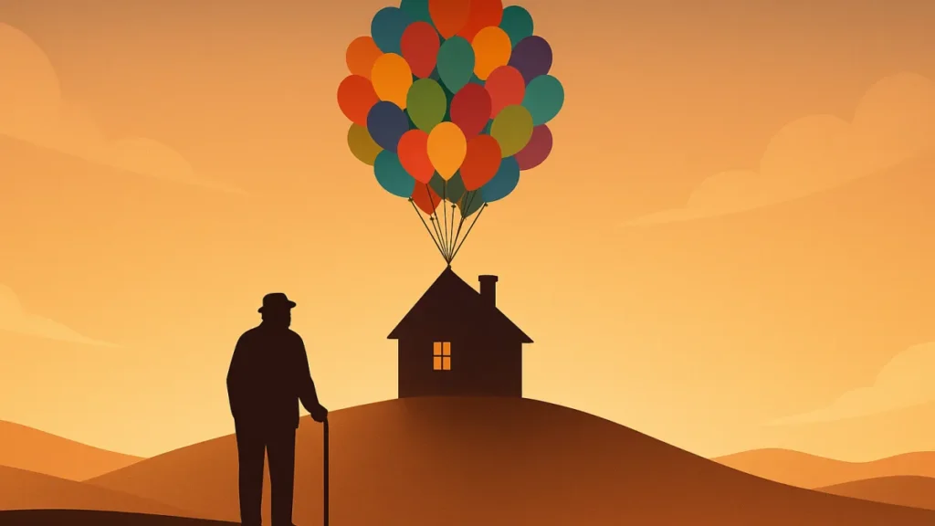 A escolha de balões como símbolo é inteligente. Eles representam leveza, fuga e contraste com a casa, que simboliza raízes e memórias.